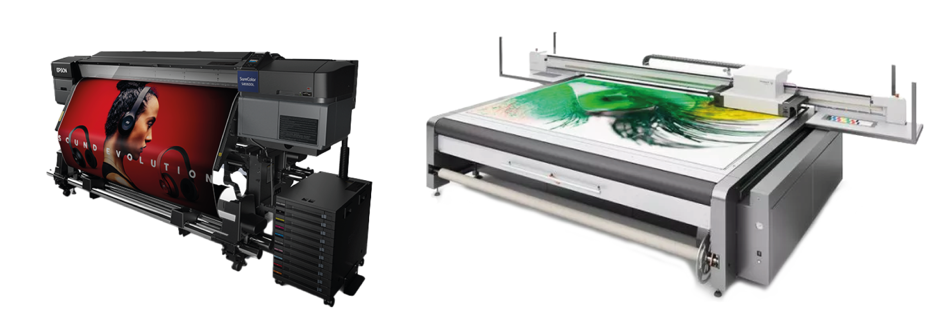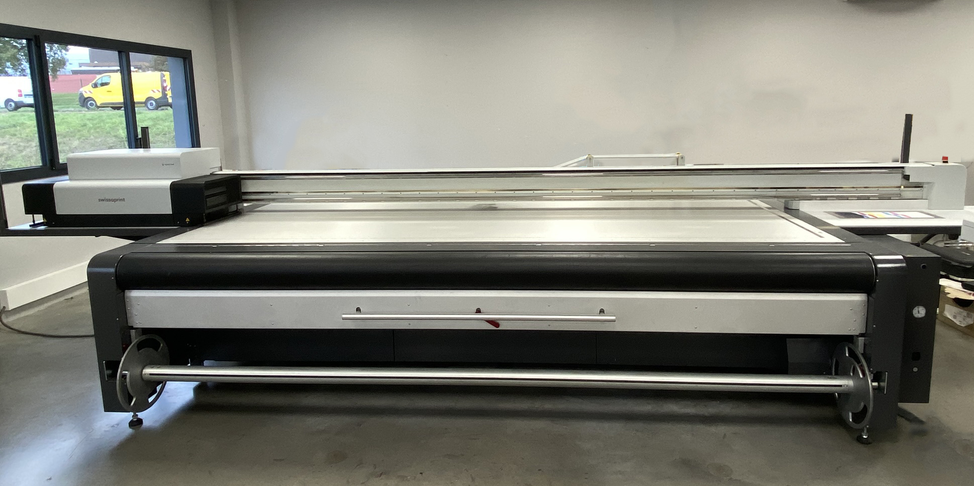 Notre parc d'imprimantes se compose d'imprimantes roll to roll pour l'impression de supports souples et d'imprimantes à plat (impression directe UV) pour les supports rigides.