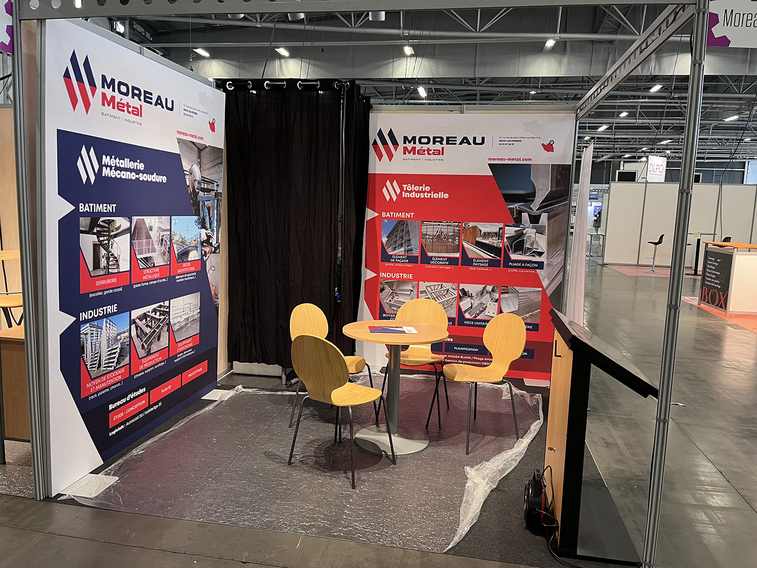 - Mobilier et supports sur mesure : sièges, tables, porte-affiches, etc.