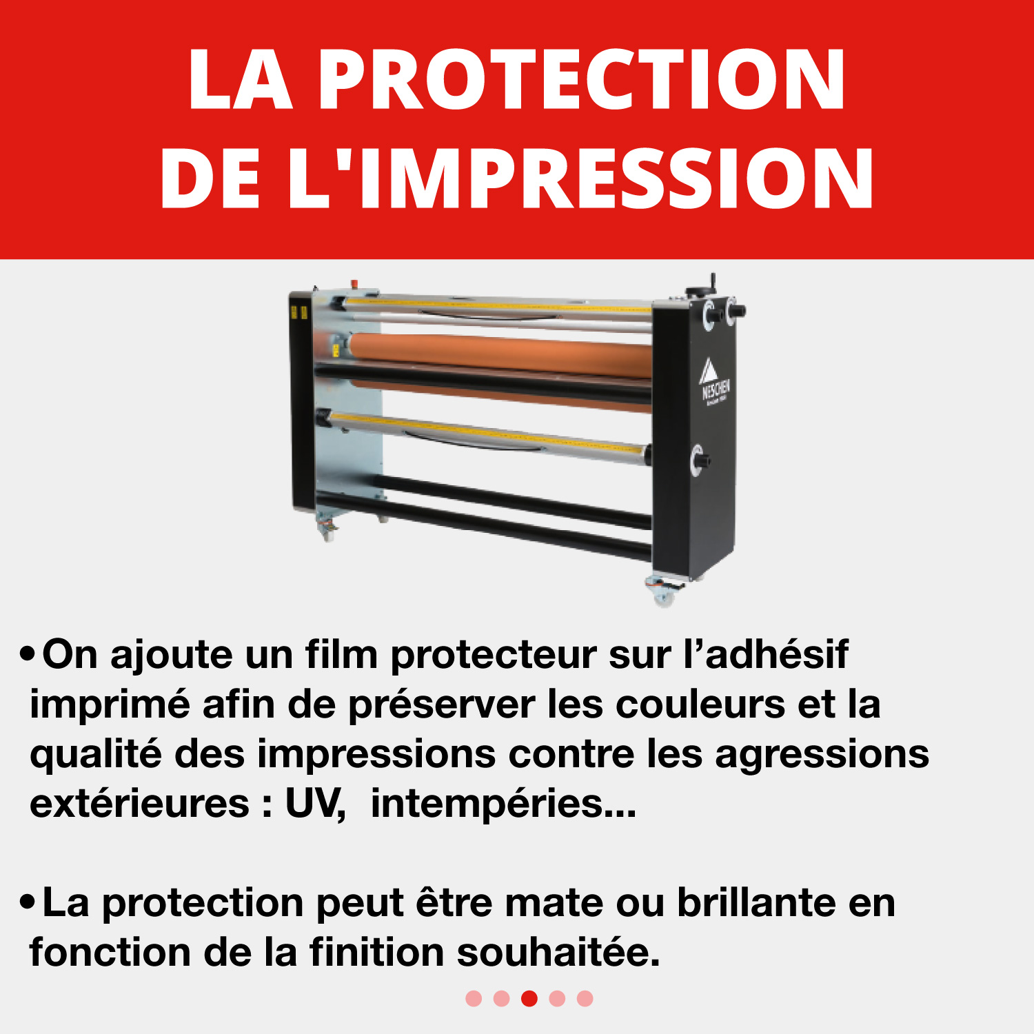 Après impression, nous ajoutons un film protecteur afin de préserver les couleurs et la qualité des visuels face aux agressions extérieures : UV, intempéries, usure…